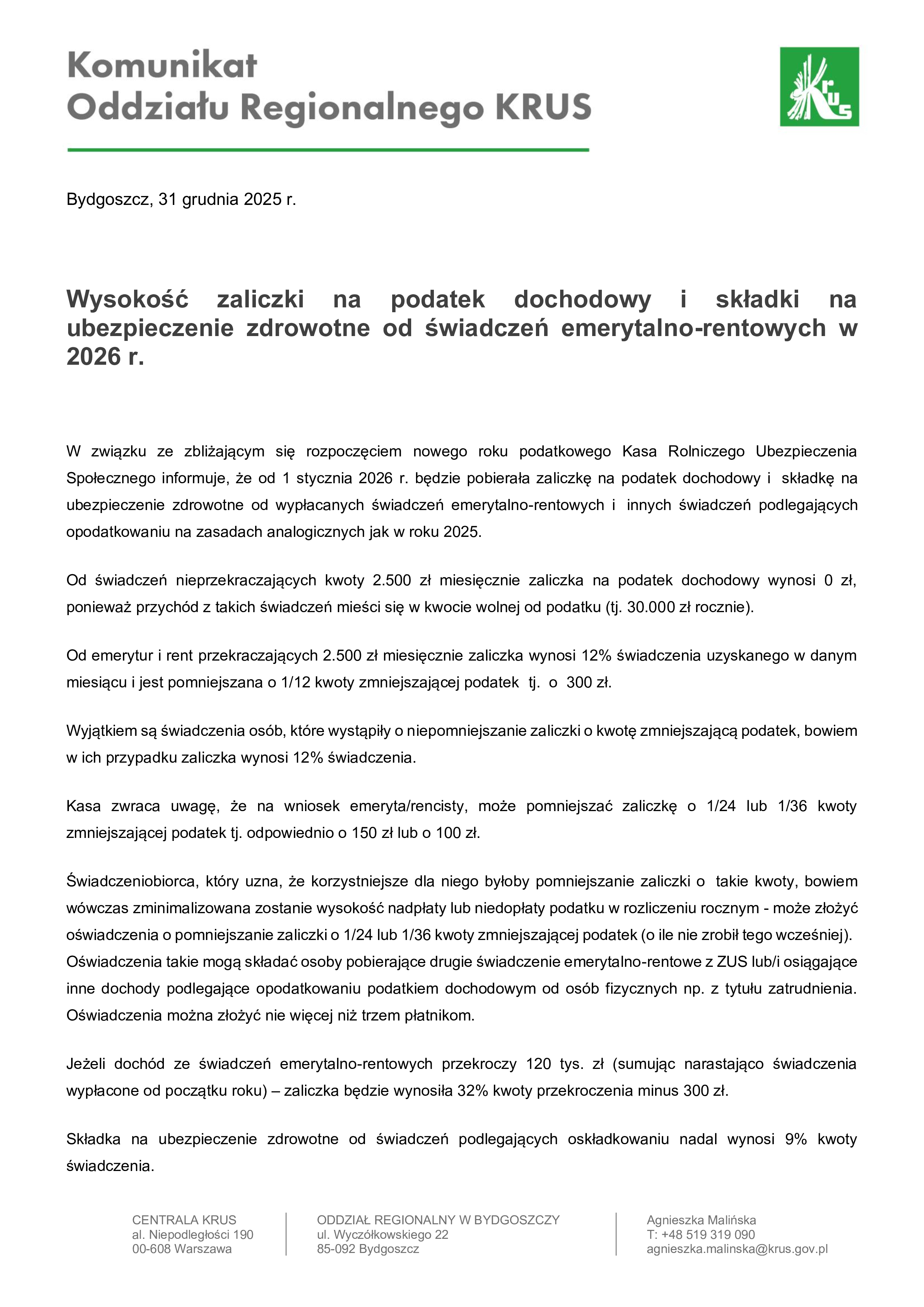 Komunikat Oddziału Regionalnego KRUS w sprawie wysokości zaliczki na podatek dochodowy i składki na ubezpieczenie zdrowotne od świadczeń emerytalno-rentowych w 2026 r.